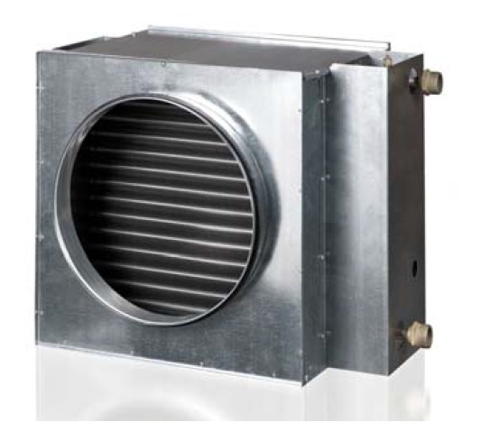 A ducted water heater designed for heating supply air in round ventilation systems.