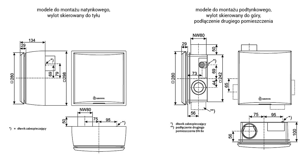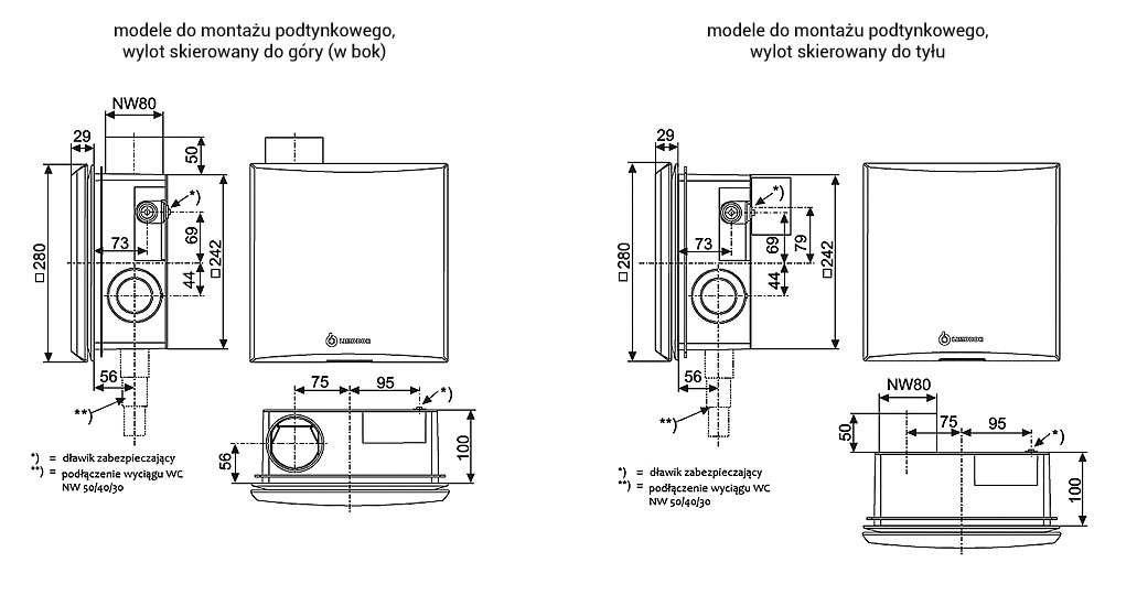 Modele do montażu podtynkowego, wylot skierowany do góry, podłączenie drugiego pomieszczenia