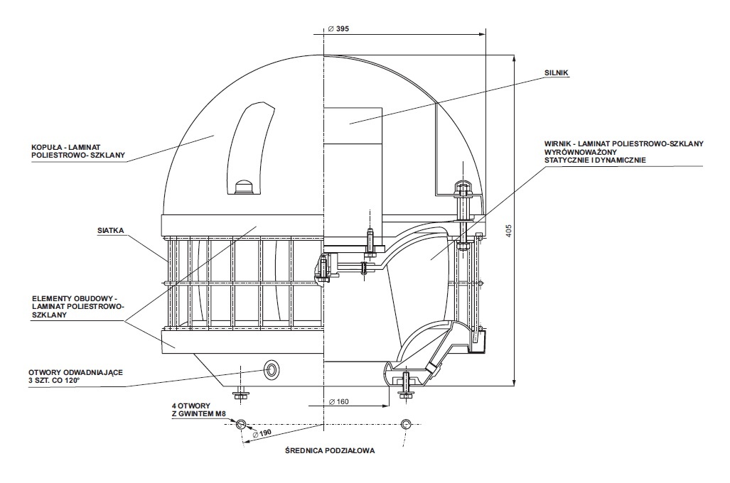 Made of polyester-glass or vinylester-glass composites, which ensures high mechanical strength and resistance to atmospheric and chemical effects. The surface of the fan is colored with a gel coat (according to the RAL), which ensures aesthetic appearance for many years of use.
